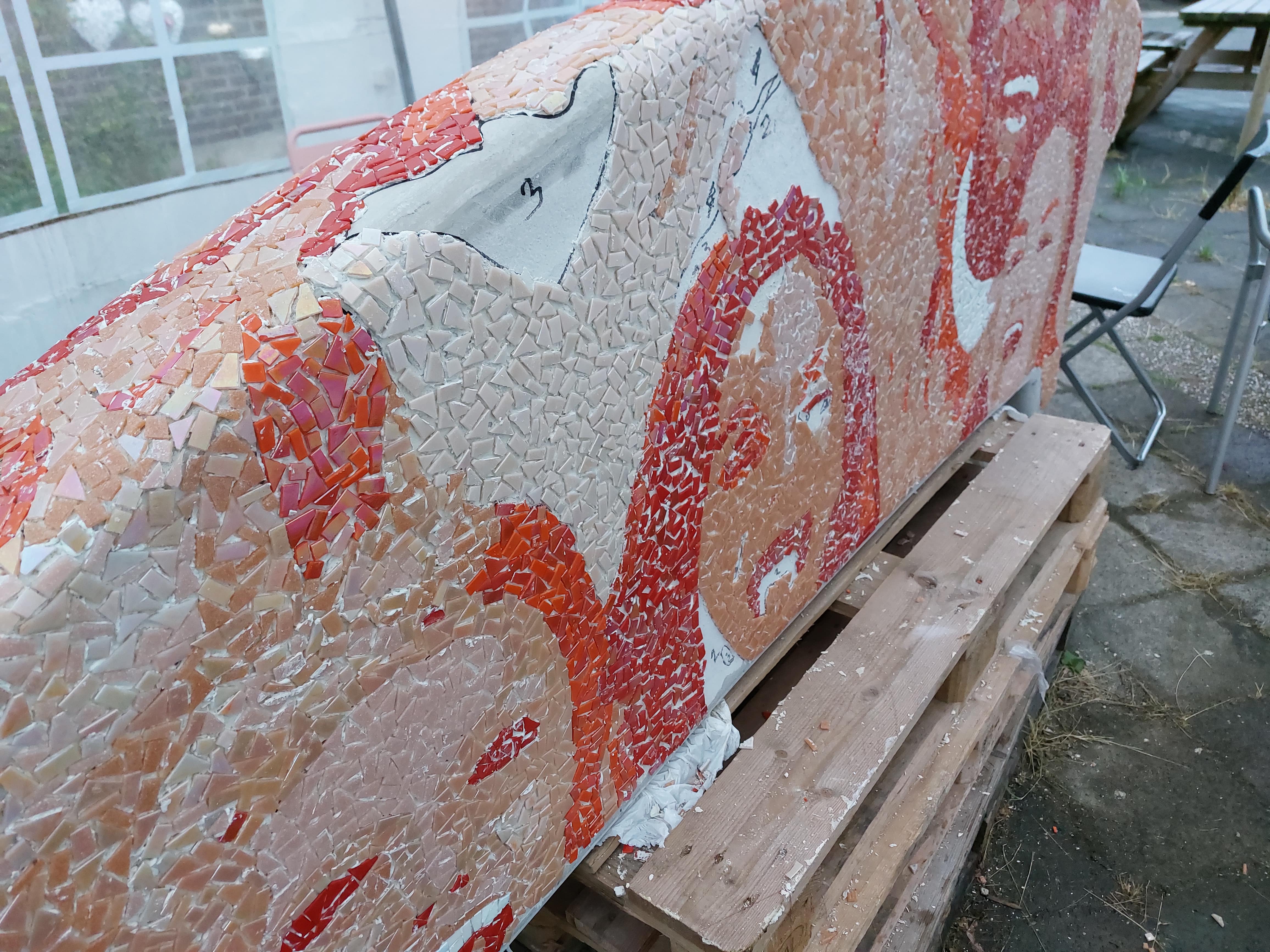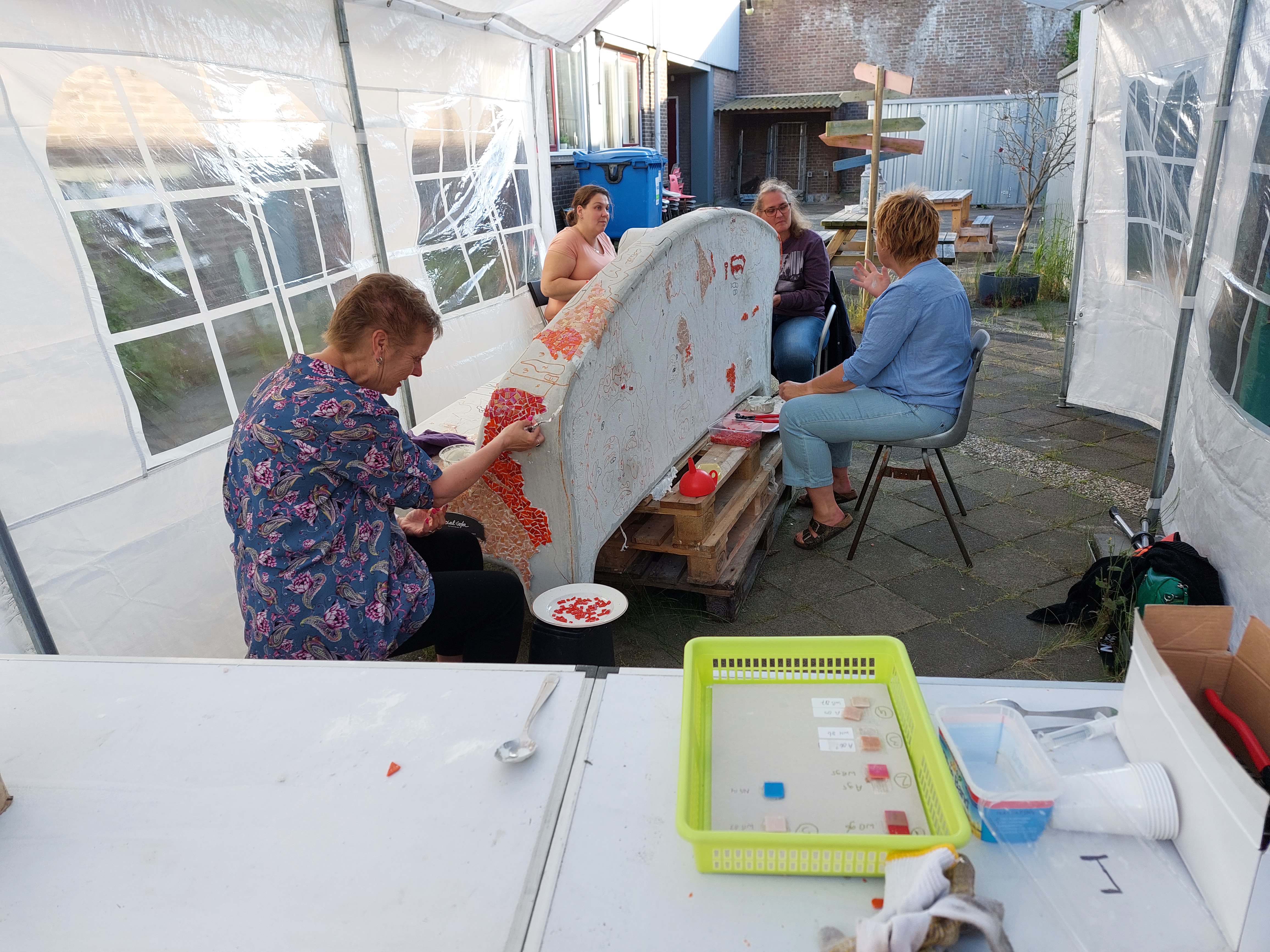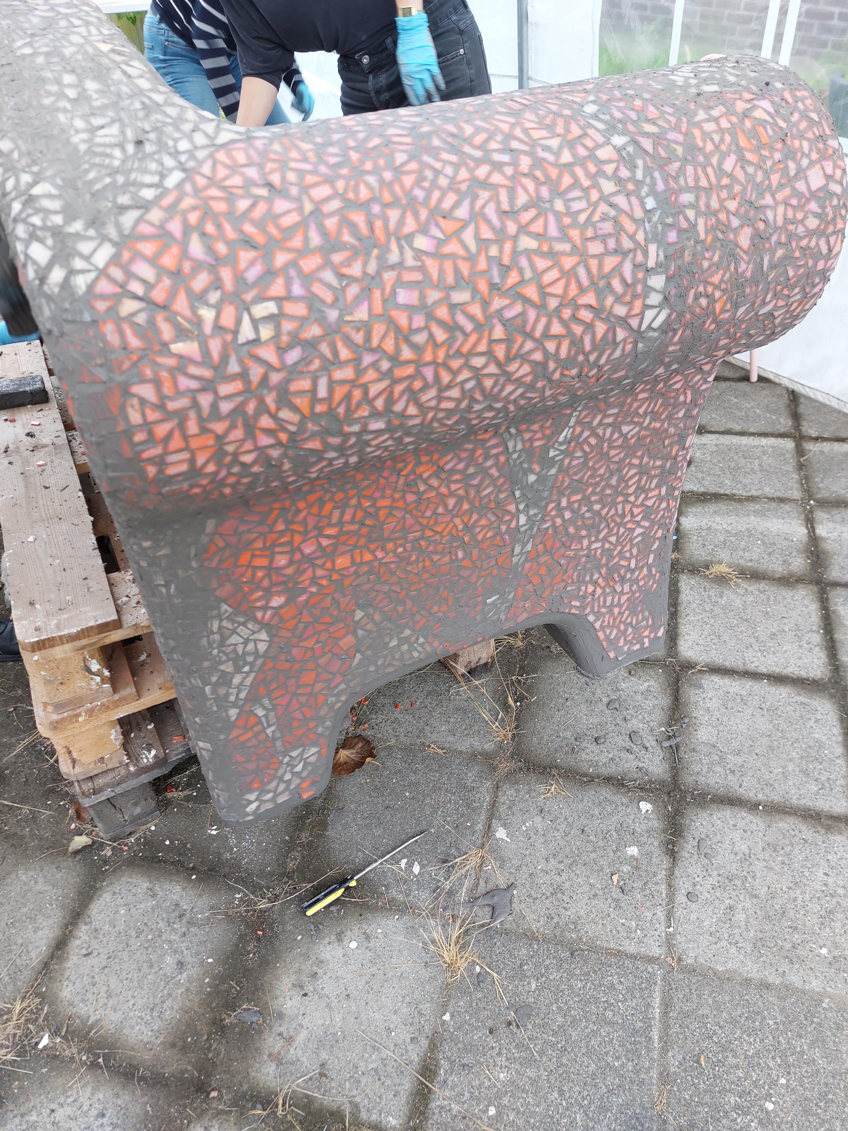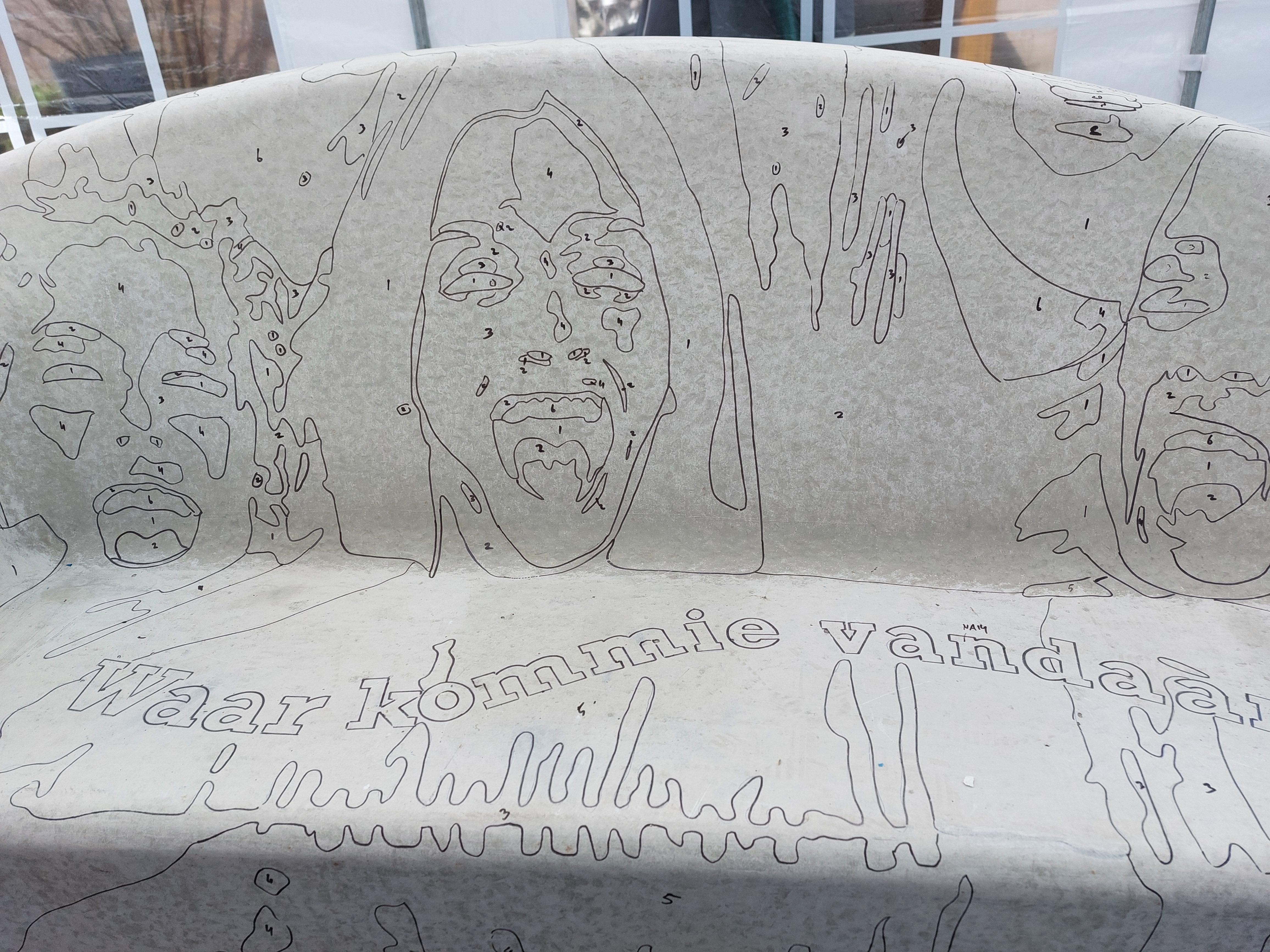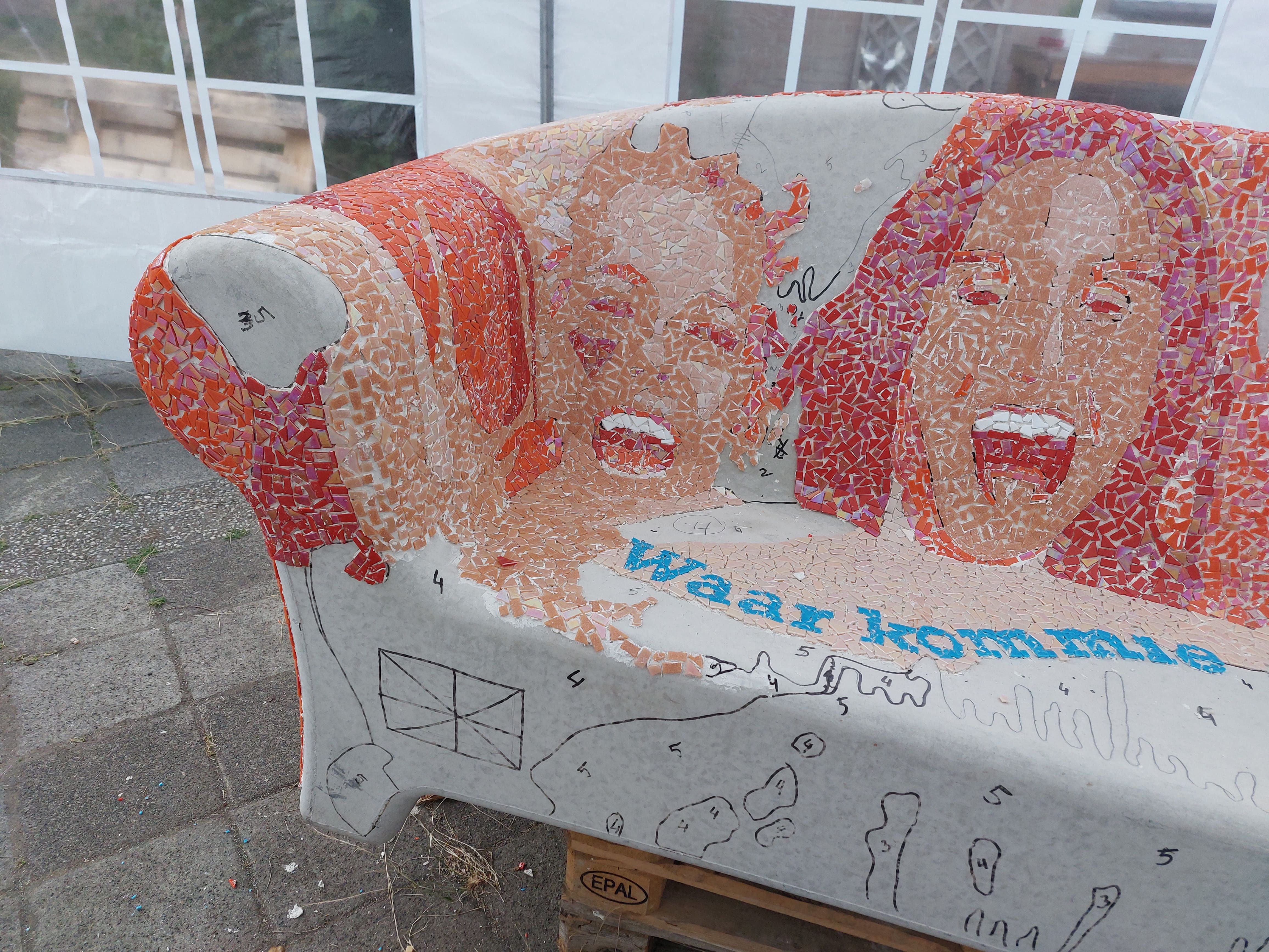 Beelden van het maakproces van de social sofa "Lachende Gezichten" die sinds 30 september 2023 op het Bachplein staat.